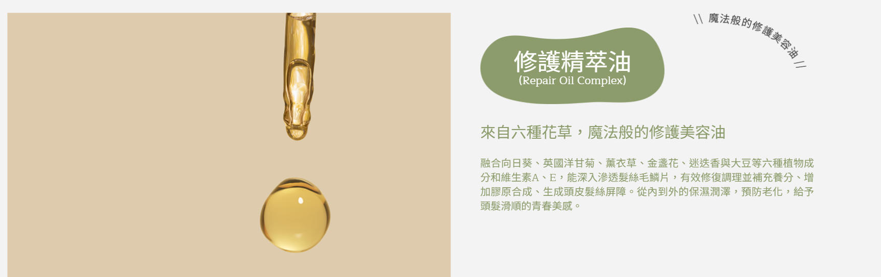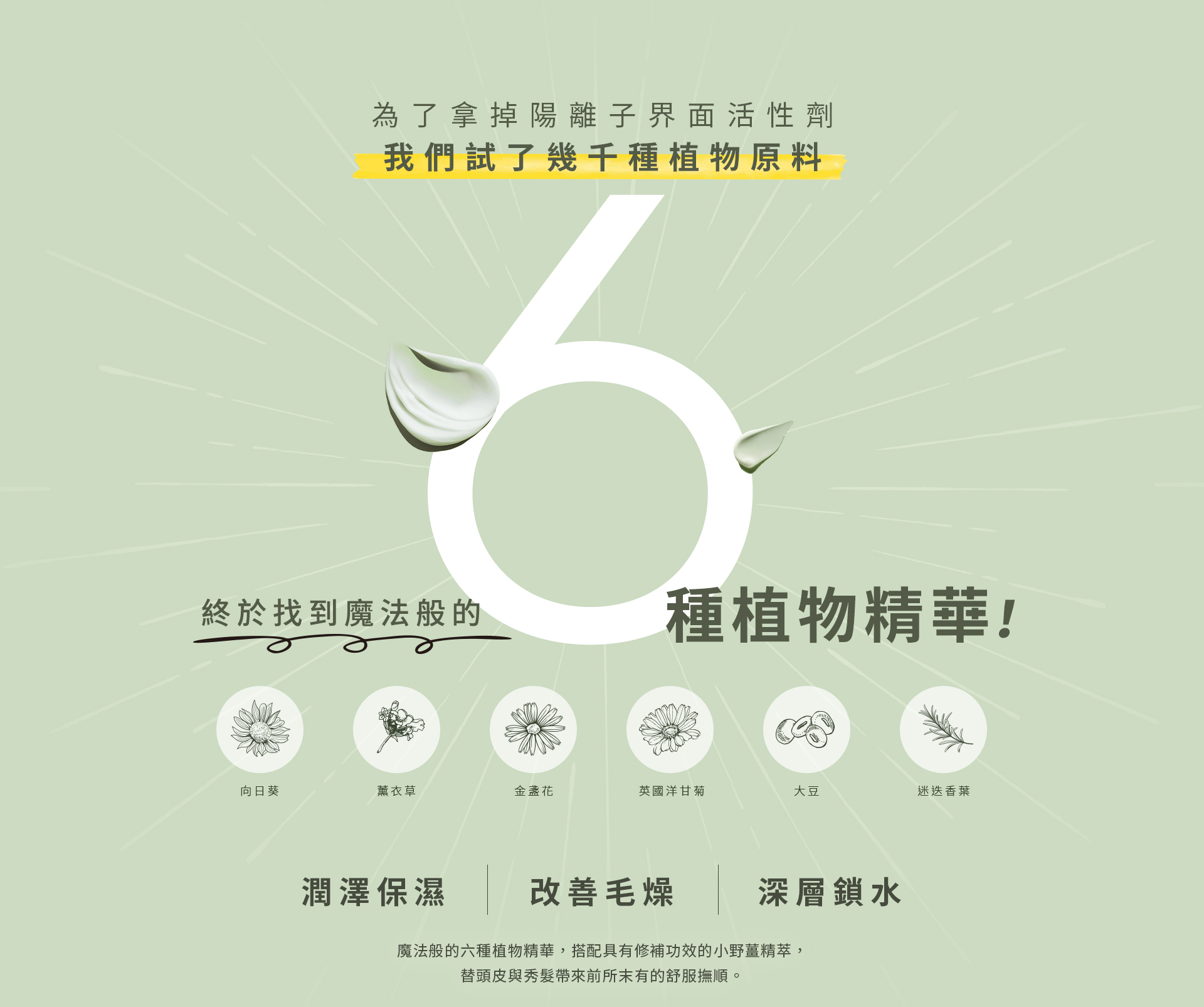 奢華添加植物精萃油,不含矽靈、不含陽離子界面活性劑,專為敏感易癢頭皮設計。
