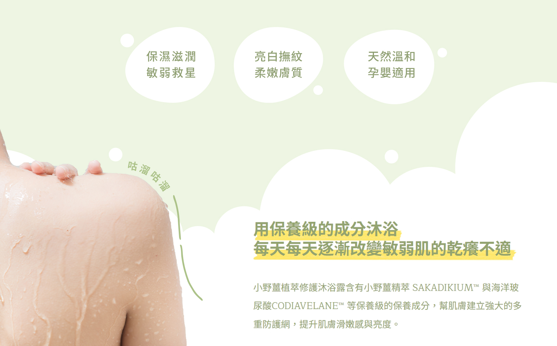 產品說明:溫和清潔沐浴露,添加小野薑精萃、水脂膜修護因子等成分,專為敏弱肌族群設計,找回健康肌底。持續使用能有效改善乾癢、粗糙、暗沉等肌膚問題,柔嫩美肌效果看得見。